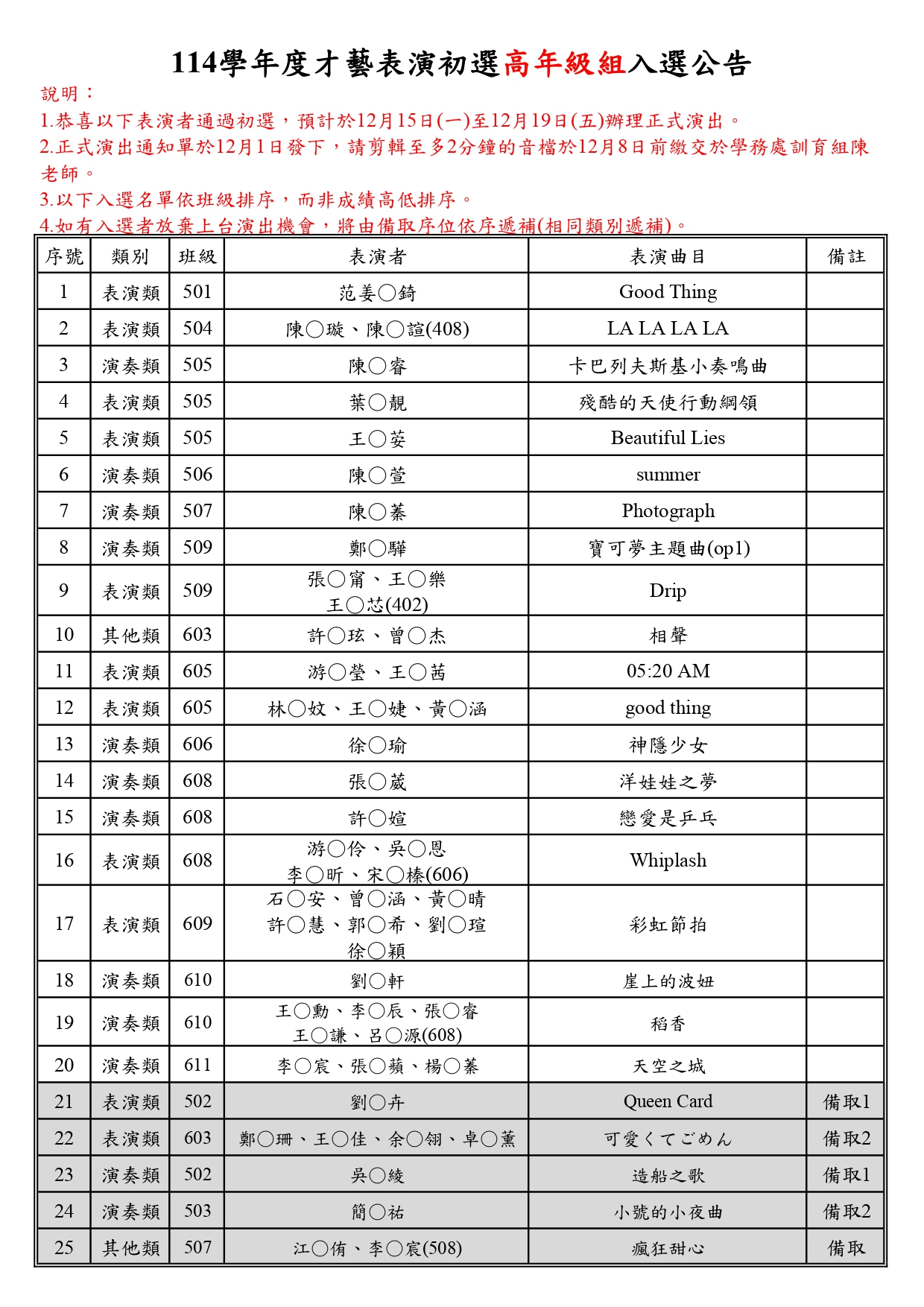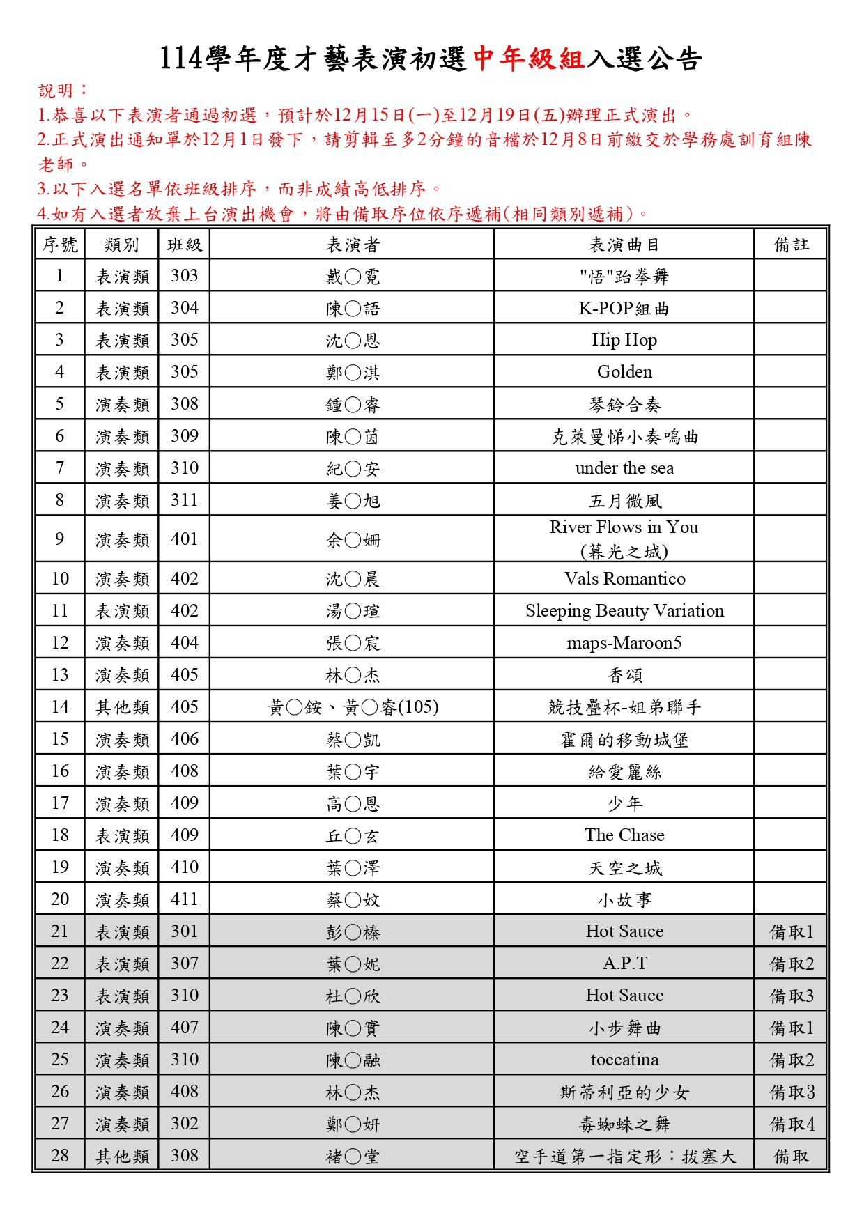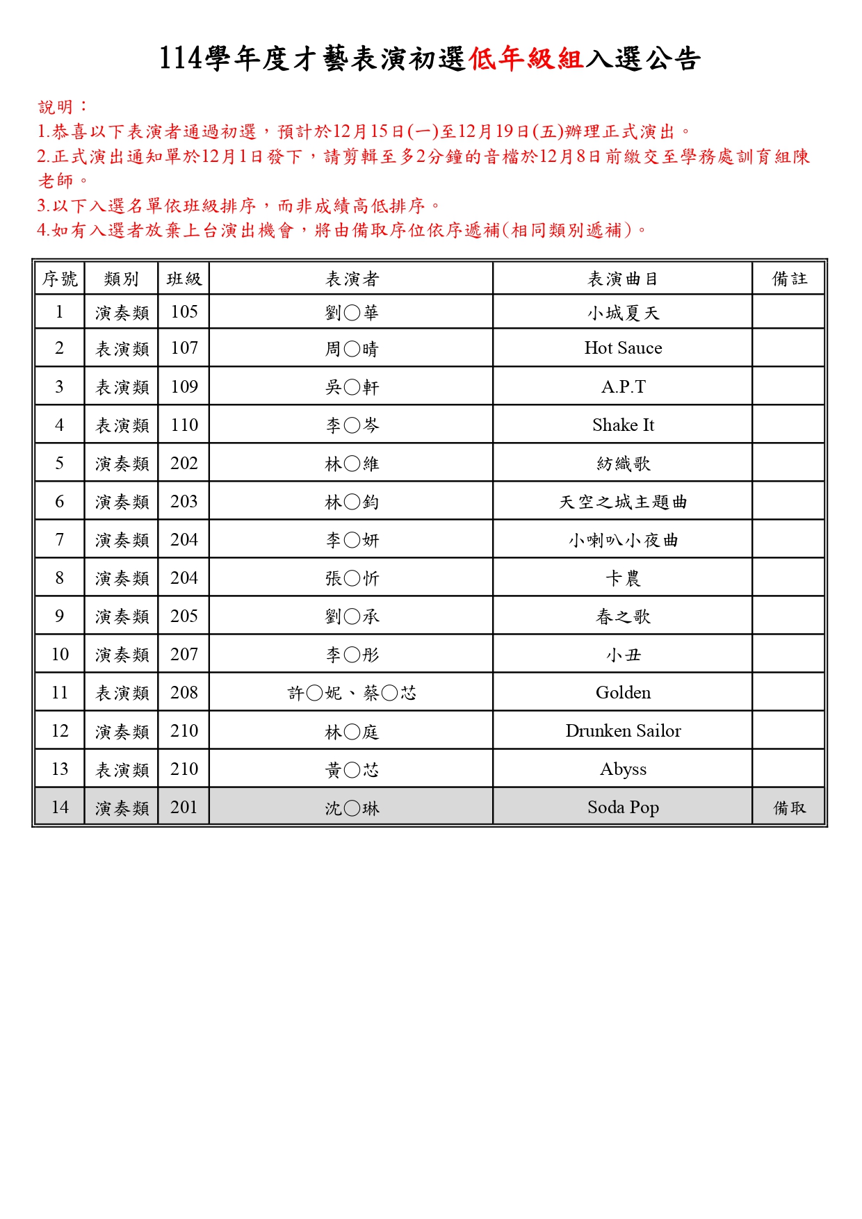| 標題 | | 【公告】114學年度才藝表演初選入選公告 | | 公告人 | 公告日期 | 類型 | 剩餘天數 | 點閱數 | 訓育組長 | 2025-11-20 18:33:01 | 一般公告 | 3天 | 331 | 內容 | 一、恭喜以下表演者通過初選,預計於12月15日(一)至12月19日(五)辦理正式 演出。